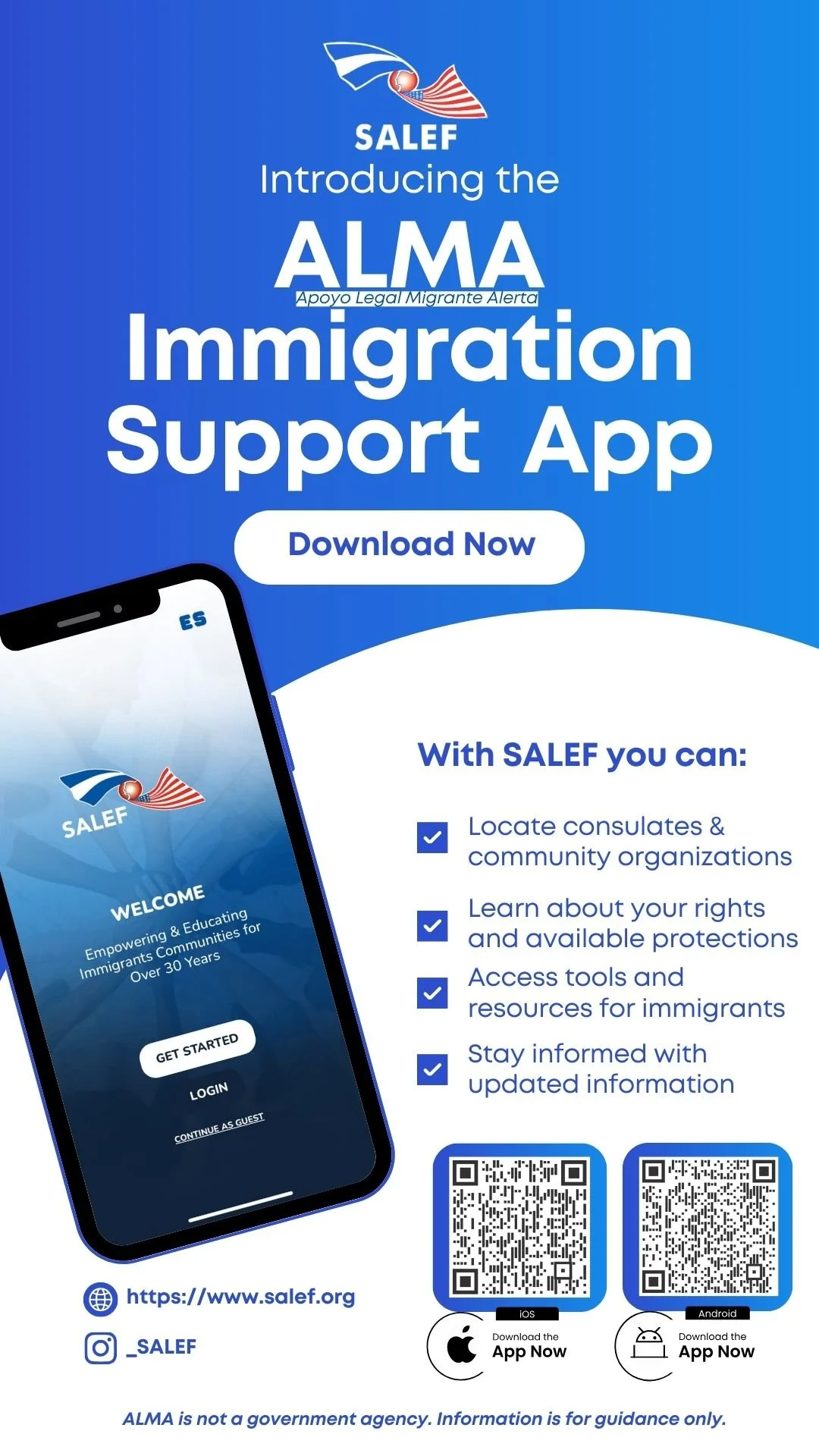Developed by the Salvadoran American Leadership and Education Fund (SALEF) in partnership with long-standing immigrants’ rights leaders, ALMA helps families plan ahead, stay connected, and get help fast during enforcement actions.